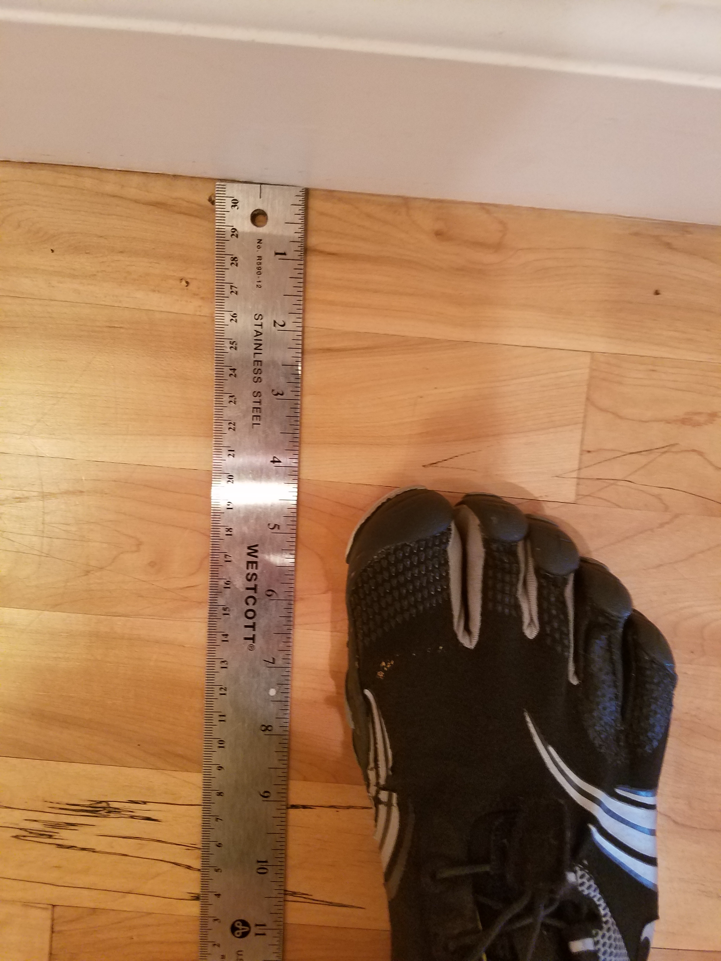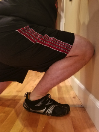 The other way to test is to lay down a measuring tape or ruler starting at the wall and coming towards where you are standing. Kneel, placing one knee and the opposite foot on the floor. The toes of the grounded foot should be at the four- or five-inch mark. Now push the knee forward. The knee should be able to contact the wall without the heel lifting off the ground. Repeat the test with the other leg as you can have different mobility in each ankle.